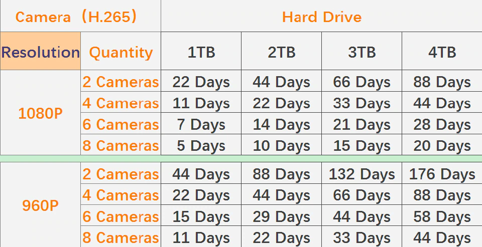 The wifi surveillance camera system comes with 1TB Hard Drive, allowing you to run straight-after when you get it. You will get rid of looking for one compatible hard drive or tools to install HDD yourself. The 1TB HDD helps to record 7/24. If you want longer recording, try motion detection recording, which will trigger recording only when motion is detected. (All day mode, Daytime mode, Night mode and custom mode Are All Acceptable to Save its Storage).