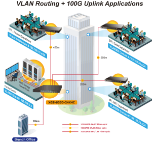 The XGS-6350-24X4C provides twenty-four 10Gbps SFP+ and four 100Gbps QSFP28 Fiber interfaces. Each of the SFP+ slots supports Dual Speed, 10GBASE-SR/LR or 1000BASE-SX/LX and each of the QSFP28 slots supports native 100 Gigabit Ethernet, 40G and 4 x 10 Gigabit Ethernet modes. Therefore, the administrator can flexibly choose the suitable SFP transceiver according to not only the transmission distance, but also the transmission speed required. The distance can be extended from 550 meters to 2km (multi-mode fiber) or up to 10/20/30/40/50/70/120 km (single-mode fiber or WDM fiber). They are well suited for applications within the enterprise data centers and distributions.