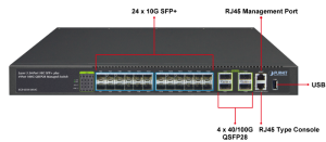 PLANET XGS-6350-24X4C is a high performance Layer 3 Managed Switch that meets the next generation Metro, Data Center, Campus and Enterprise network requirements. It has high-density 24 10G SFP+ and 4 40G/100GbE QSFP28 fiber interfaces delivered in a 1RU rugged case.