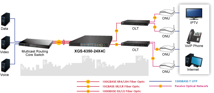 The XGS-6350-24X4C provides IPv6 management and enterprise-level secure features such as SSH, ACL, WRR (Weighted Round Robin) and RADIUS authentication. The XGS-6350-24X4C thus helps the enterprises to step in the IPv6 era with the lowest investment. In addition, you don’t need to replace the network facilities when the IPv6 FTTx edge network is built.