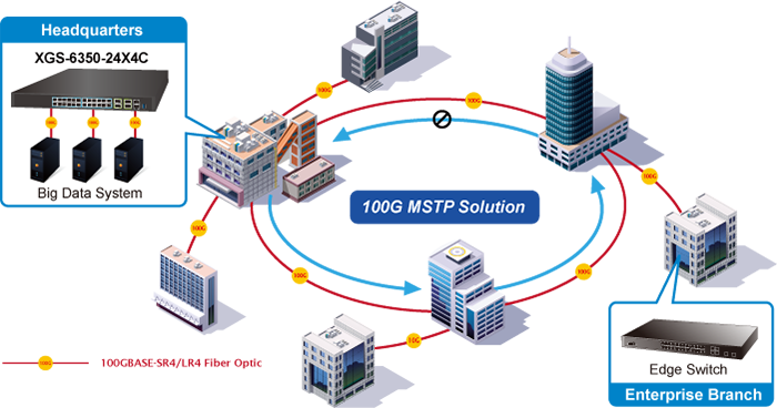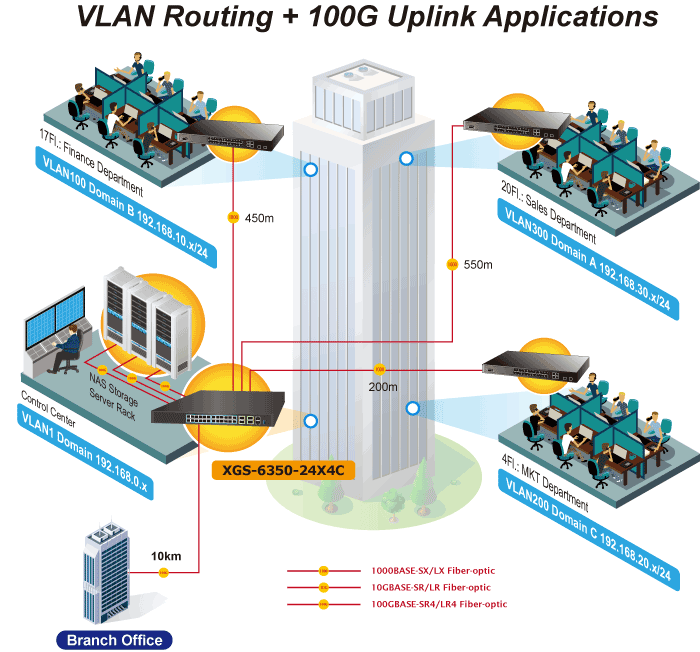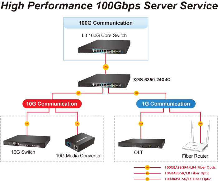 The XGS-6350-24X4C provides twenty-four 10Gbps SFP+ and four 100Gbps QSFP28 Fiber interfaces. Each of the SFP+ slots supports Dual Speed, 10GBASE-SR/LR or 1000BASE-SX/LX and each of the QSFP28 slots supports native 100 Gigabit Ethernet, 40G and 4 x 10 Gigabit Ethernet modes. Therefore, the administrator can flexibly choose the suitable SFP transceiver according to not only the transmission distance, but also the transmission speed required. The distance can be extended from 550 meters to 2km (multi-mode fiber) or up to 10/20/30/40/50/70/120 km (single-mode fiber or WDM fiber). They are well suited for applications within the enterprise data centers and distributions.