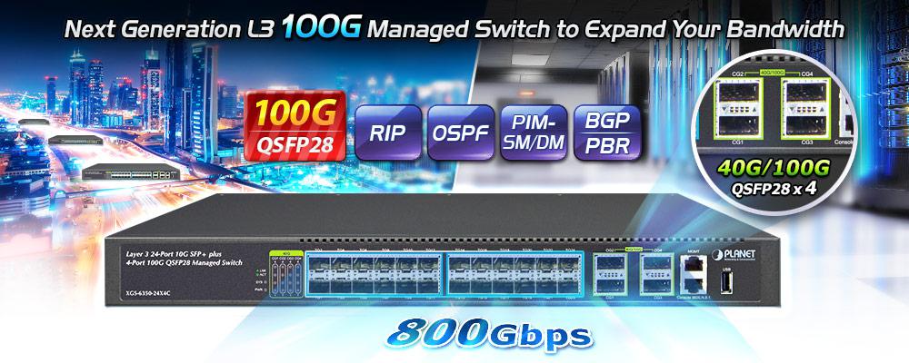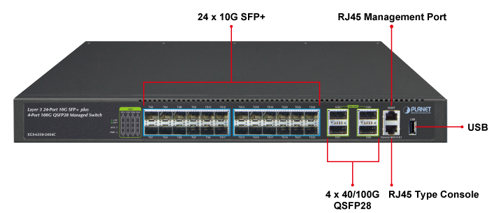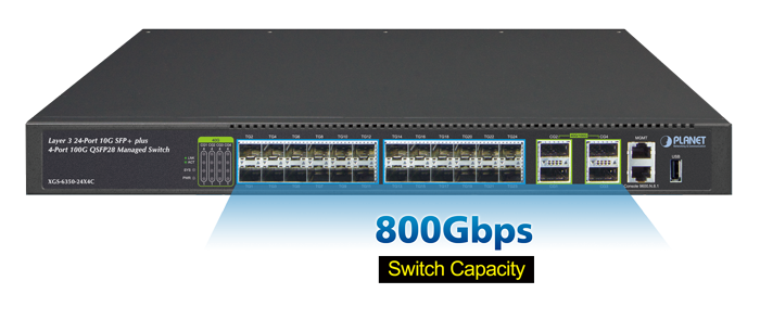 PLANET XGS-6350-24X4C is a high performance Layer 3 Managed Switch that meets the next generation Metro, Data Center, Campus and Enterprise network requirements. It has high-density 24 10G SFP+ and 4 40G/100GbE QSFP28 fiber interfaces delivered in a 1RU rugged case.