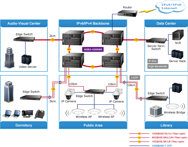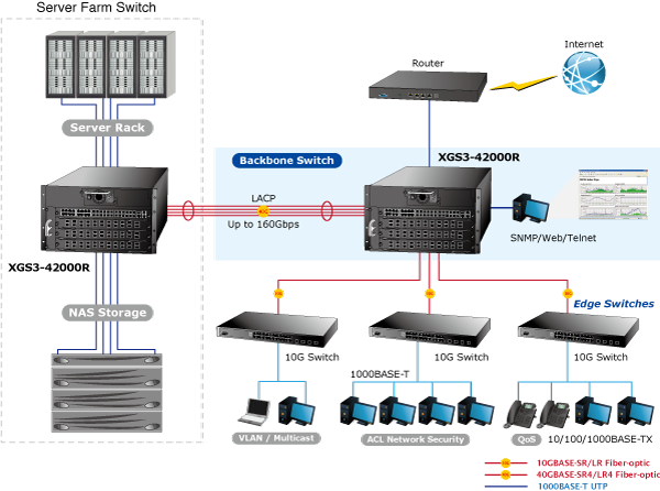 10/40-Gigabit Ethernet, which adopts the full-duplex technology instead of the low-speed, half-duplex CSMA/CD protocol, is a big leap in the evolution of Ethernet. 10/40-Gigabit Ethernet can be deployed in the star or ring topology. With the 10/40-Gigabit Ethernet technology applied, the XGS3-42000R provides broad bandwidth and powerful processing capacity. It is suitable for metropolitan networks and wide area networks. Using the XGS3-42000R, users can simplify network structures and reduce cost of network construction.